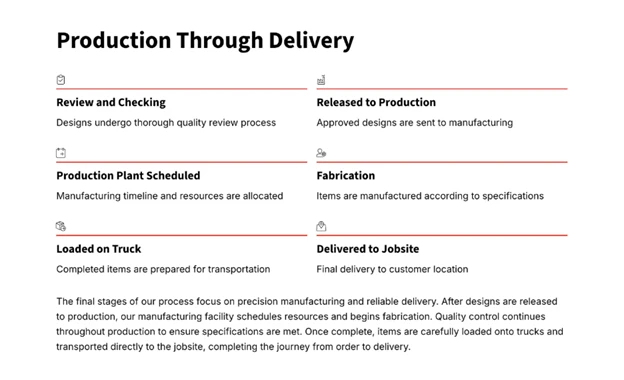 The designs then undergo a thorough review and checking process before being released to production. Once released, the production plant is scheduled, and fabrication begins. The items are then loaded on the truck for transportation and delivered to the jobsite.