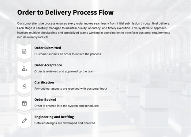The high-level process flow from the initial order placement to final delivery involves several detailed stages. First, the customer submits an order. The order then goes through an acceptance stage, where it is reviewed and approved. If necessary, clarification is sought to resolve any aspects that are unclear. Once clarified, the order is booked into the system and scheduled for engineering and drafting work. During this phase, detailed designs are developed and finalized.